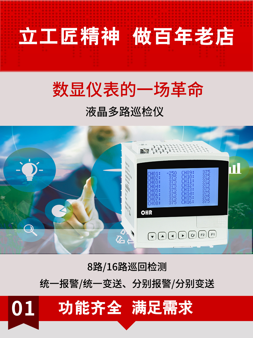 虹潤公司是專業(yè)生產(chǎn)多路溫度巡檢儀的國家專精特新“小巨人”企業(yè),生產(chǎn)的液晶多路巡檢儀,具有8路/16路測量通道,全切換信號輸入,統(tǒng)一報警統(tǒng)一變送輸出,分別報警分別變送輸出,RS485/RS232通訊等特點。產(chǎn)品獲得巡回檢測顯示方法及裝置、儀表殼體等2項國家發(fā)明專利,主持起草工業(yè)過程控制系統(tǒng)用模擬輸入兩位或多位輸出儀表、物聯(lián)網(wǎng)智能溫度儀表通用技術(shù)條件等2項國家標(biāo)準(zhǔn),以及通信系統(tǒng)多通道數(shù)據(jù)采集控制終端規(guī)范軍用標(biāo)準(zhǔn),參與國際5G標(biāo)準(zhǔn)制定,取得液晶多回路測量顯示控制儀等4項相關(guān)軟件著作權(quán)。產(chǎn)品廣泛應(yīng)用于電力、石化、冶金、制藥、水處理、機械配套等各種工業(yè)現(xiàn)場。