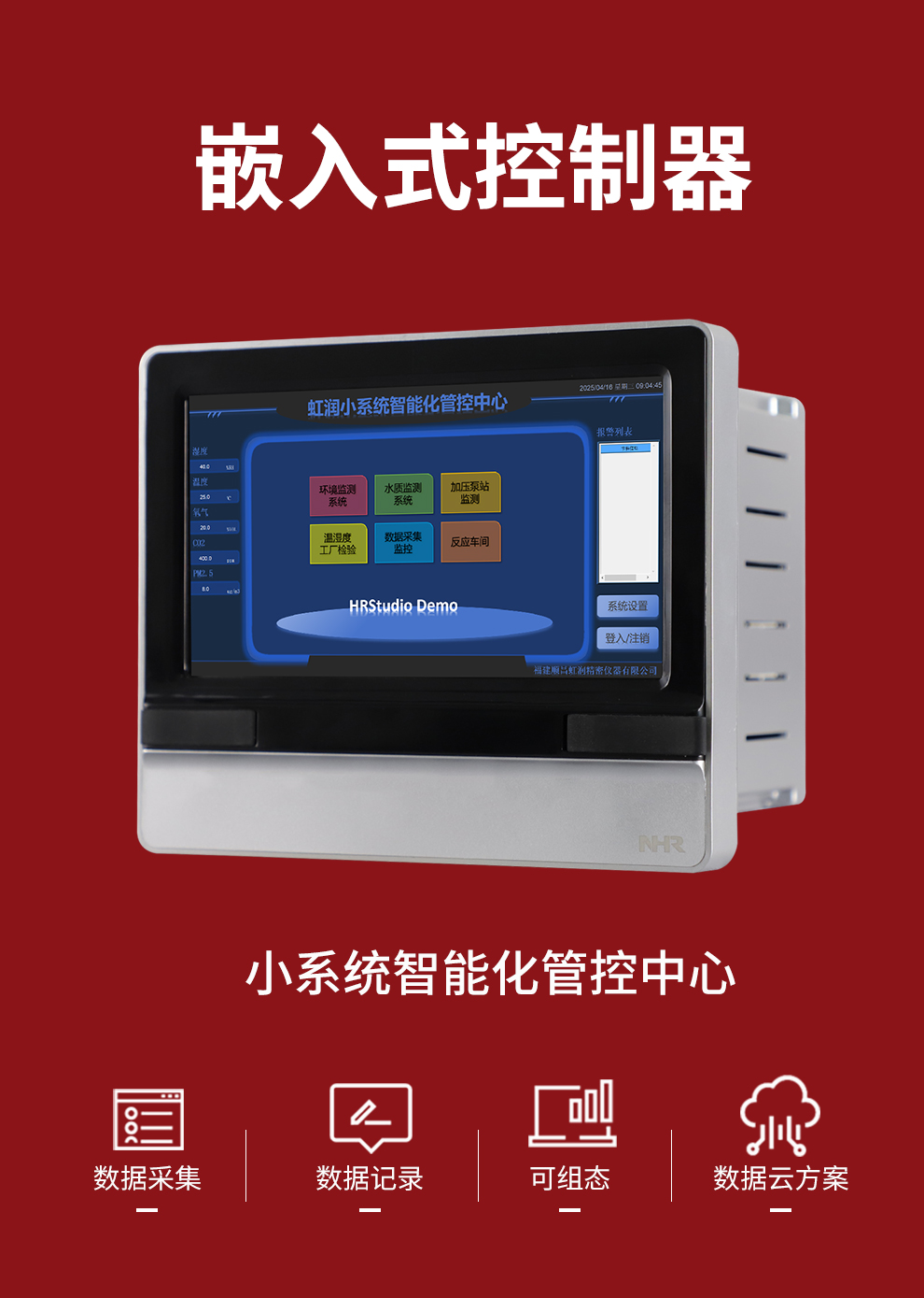 虹潤公司是專業(yè)生產(chǎn)觸摸屏的國家專精特新“小巨人”企業(yè)。生產(chǎn)的嵌入式控制器,具有數(shù)據(jù)采集與記錄,內(nèi)置與外配組態(tài)軟件,數(shù)據(jù)云方案,RS485/以太網(wǎng)通訊等特點。產(chǎn)品獲得嵌入式數(shù)據(jù)采集工作站組網(wǎng)系統(tǒng)、數(shù)據(jù)采集工作站、無紙記錄儀、智能化控制器、巡回檢測顯示方法及裝置等5項國家發(fā)明專利;主持起草通信系統(tǒng)多通道數(shù)據(jù)采集控制終端規(guī)范軍用標準,物聯(lián)網(wǎng)智能記錄儀表通用技術(shù)條件國家標準,以及空間數(shù)據(jù)與信息數(shù)據(jù)傳輸系統(tǒng)等2項航天標準,參與國際5G標準制定;取得嵌入式數(shù)據(jù)采集控制工作站以及HRStudio畫面組態(tài)軟件等4項相關(guān)軟件著作權(quán)。產(chǎn)品廣泛應(yīng)用于航天航空、化工、冶金、制藥、設(shè)備配套、現(xiàn)代農(nóng)業(yè)、環(huán)境監(jiān)測等諸多領(lǐng)域。