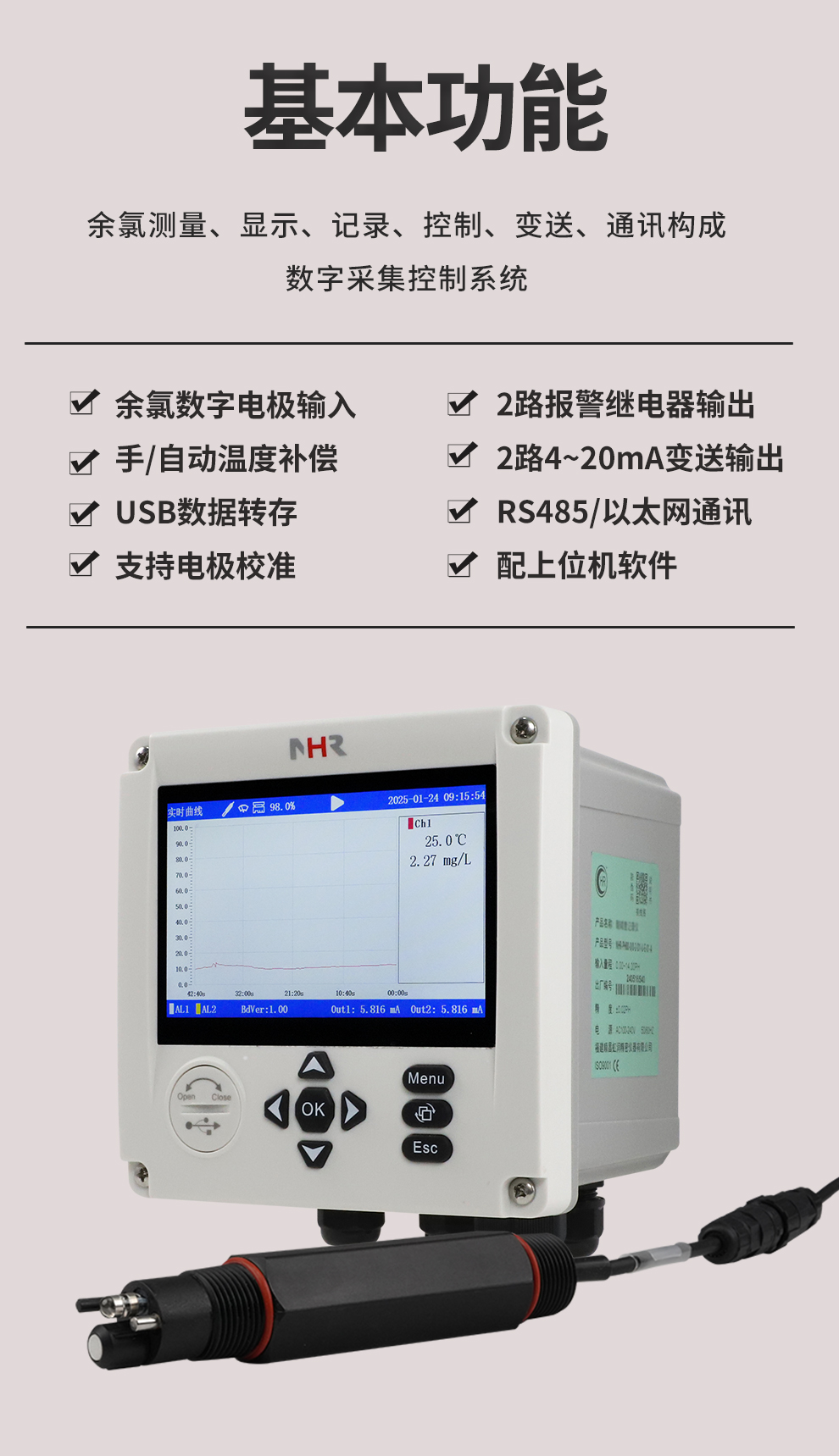 虹潤公司是專業(yè)生產(chǎn)水質(zhì)分析儀的國家專精特新“小巨人”企業(yè)。生產(chǎn)的余氯記錄儀,具有彩色大屏顯示,測量精準(zhǔn)穩(wěn)定不跳字,數(shù)據(jù)記錄與轉(zhuǎn)存,RS485/以太網(wǎng)通訊,配套上位機(jī)管理軟件等特點(diǎn)。產(chǎn)品獲得一種平板無紙記錄儀、智能化控制器等2項(xiàng)國家發(fā)明專利;主持起草物聯(lián)網(wǎng)智能記錄儀表通用技術(shù)條件現(xiàn)場設(shè)備工具(FDT)接口規(guī)范.、過程分析技術(shù)系統(tǒng)等3項(xiàng)國家標(biāo)準(zhǔn),以及通信系統(tǒng)多通道數(shù)據(jù)采集控制終端規(guī)范軍用標(biāo)準(zhǔn),參與國際5G標(biāo)準(zhǔn)制定;取得余氯無紙記錄儀等3項(xiàng)相關(guān)軟件著作權(quán)。產(chǎn)品廣泛應(yīng)用于市政供水、泳池、污水處理、藥療衛(wèi)生、食品、水產(chǎn)養(yǎng)殖、工業(yè)用水處理等諸多領(lǐng)域。