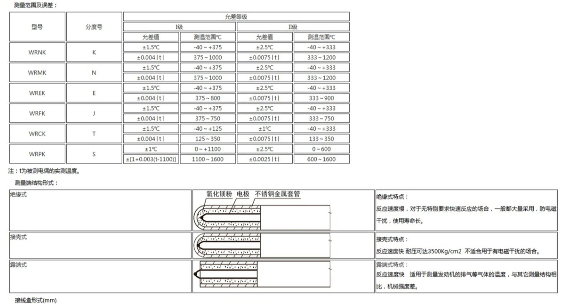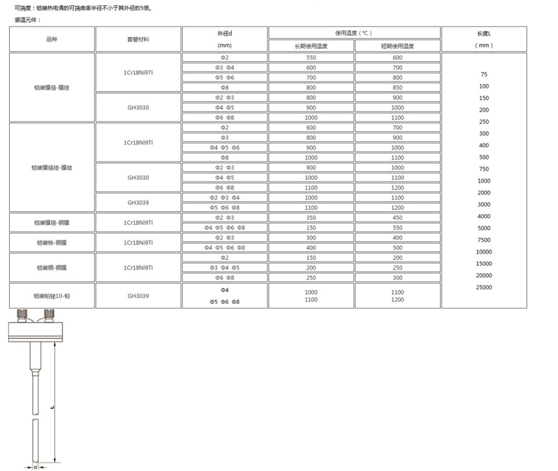 鎧裝熱電偶作為溫度測量傳感器,通常與溫度變送器、調(diào)節(jié)器及顯示儀表等配套使用,組成過程控制系統(tǒng),用以直接測量或控制各種生產(chǎn)過程中0-1800℃范圍內(nèi)的流體、蒸汽和氣體介質(zhì)以及固體表面等溫度。鎧狀熱電偶具有能彎曲、耐高壓、熱響應(yīng)時間快和堅固耐用等許多優(yōu)點(diǎn)。