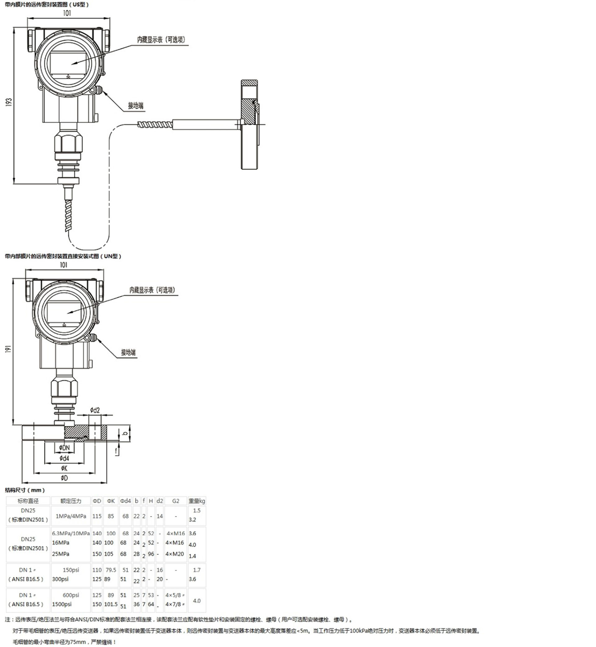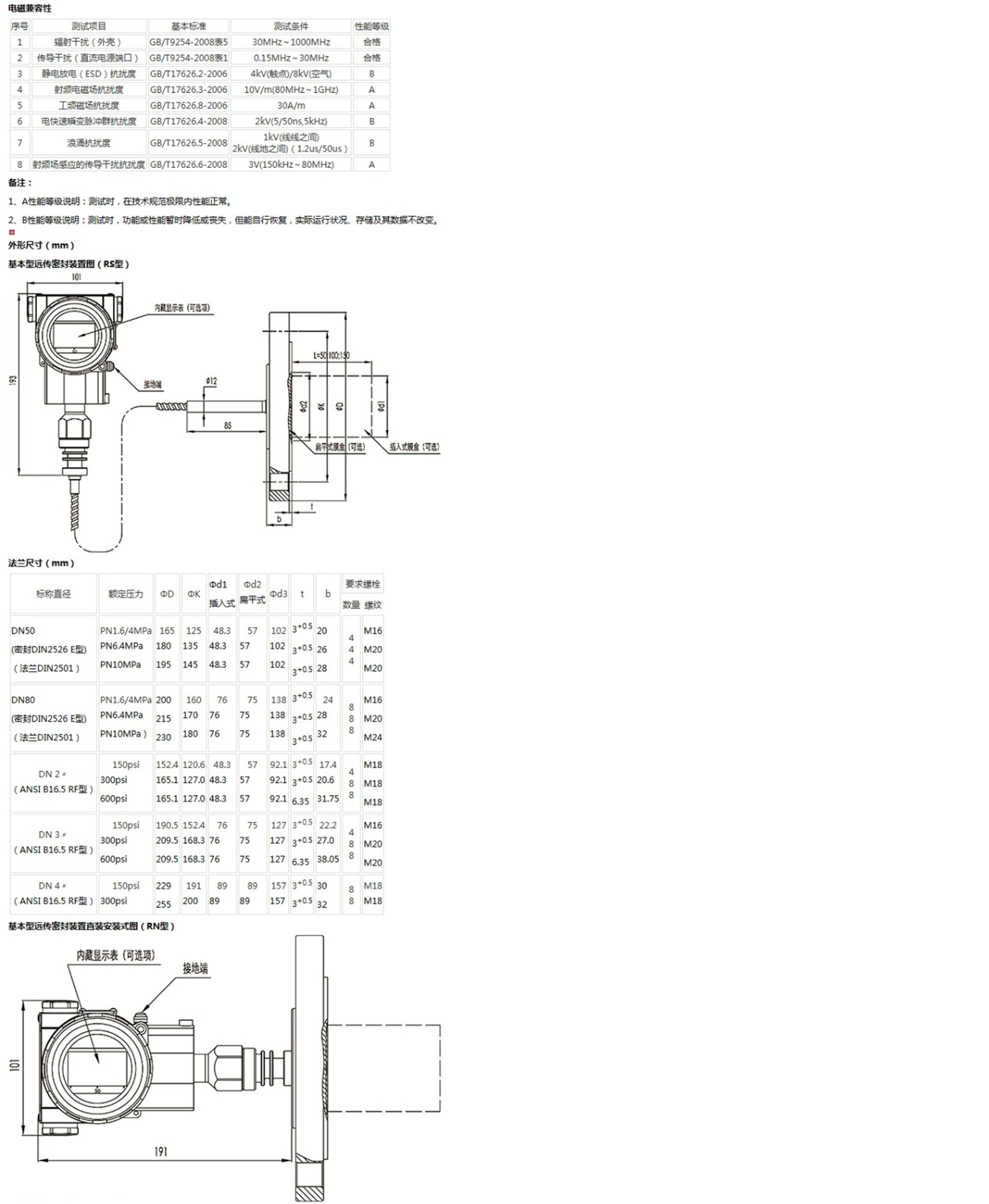 該產(chǎn)品用于測量液體、氣體或蒸汽的液位、密度、壓力,將其轉(zhuǎn)變成4~20mA (HART)電流輸出信號,可通過RST375手持終端對它們進(jìn)行參數(shù)設(shè)定、過程監(jiān)控等。測量范圍(未遷移時)為0-6kPa~25MPa,液位法蘭的額定壓力分別為:1.6/4MPa、6.4MPa、10MPa、150psi、300psi或600psi。